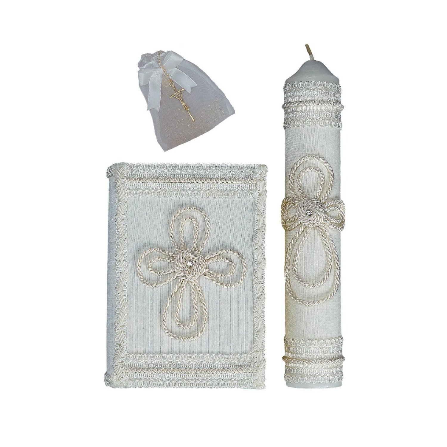 Set con figura central tipo lazo en relieve y acabados decorativos que enmarcan la pieza, acompañado de vela y accesorios a juego que mantienen una estética uniforme.