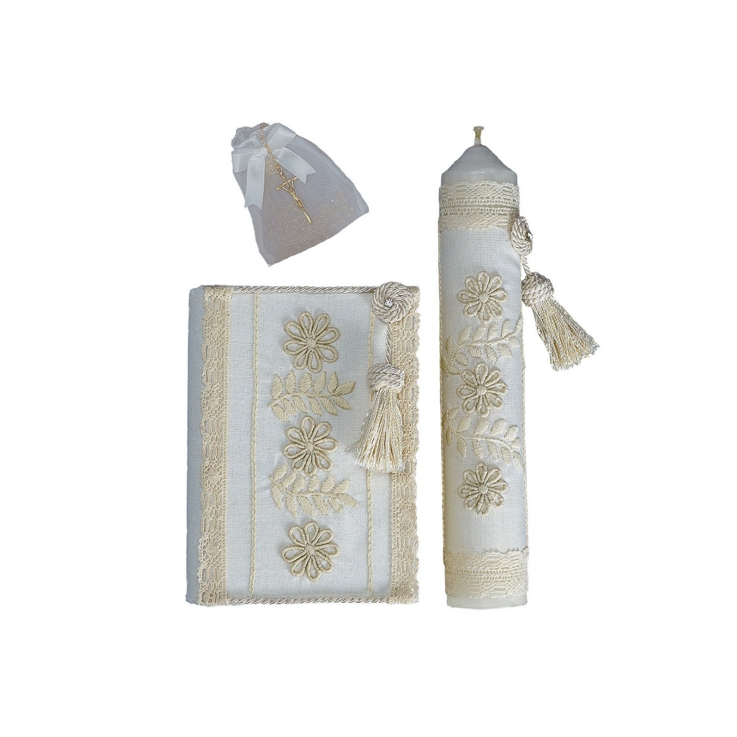 Set de ceremonia con vela y libro decorados con aplicaciones florales en relieve, encaje delicado y borlas que aportan un estilo elegante y distintivo.