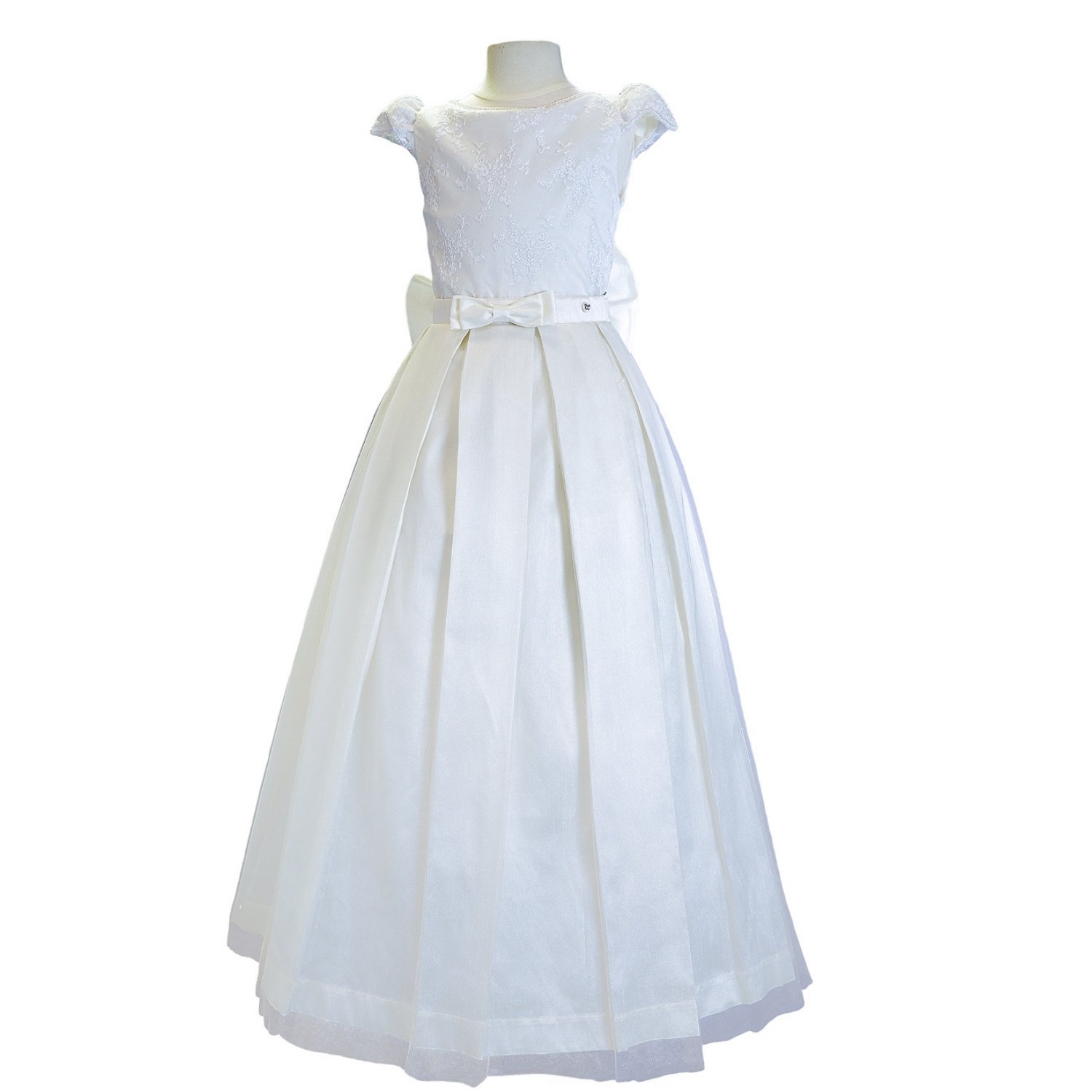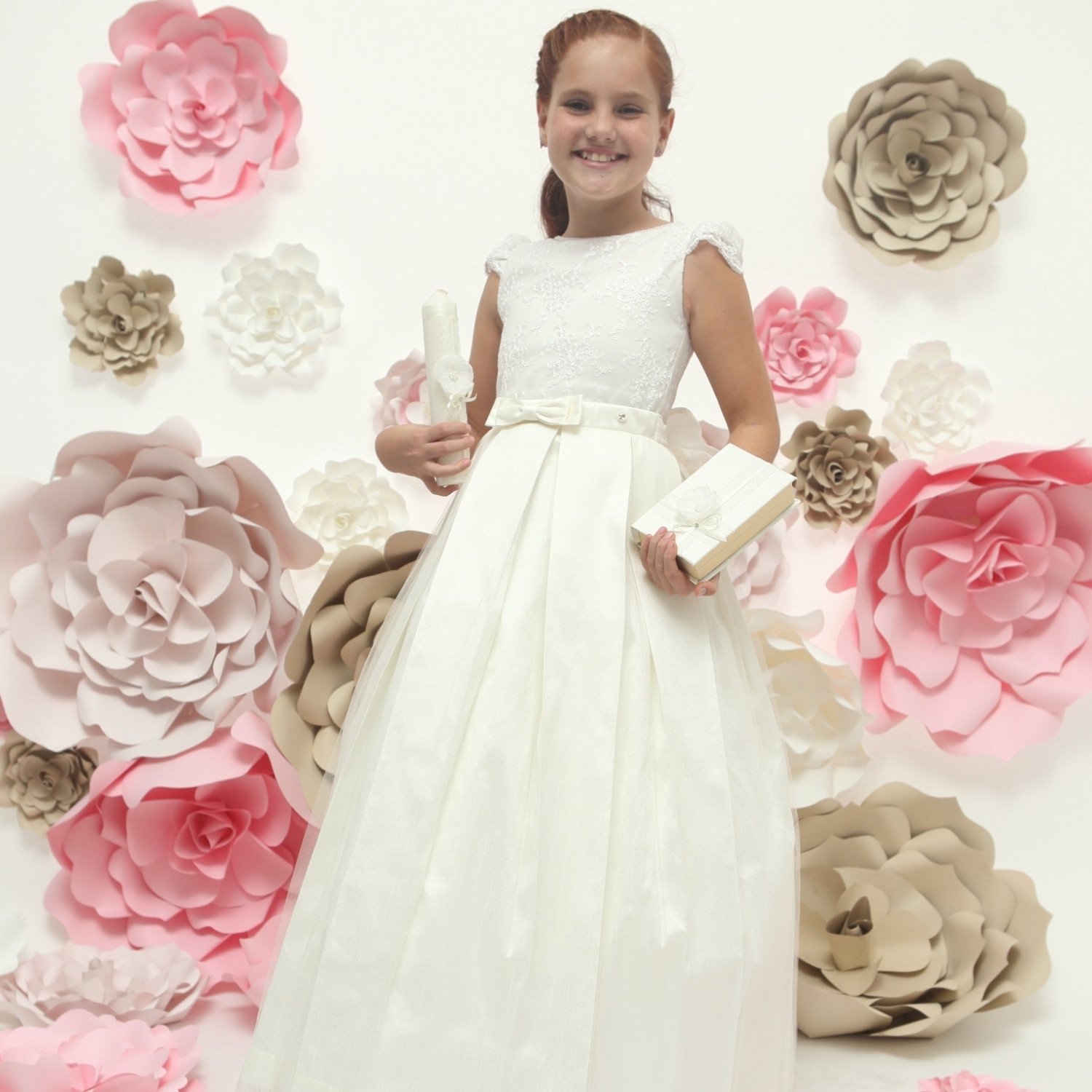 Este diseño destaca por su fino bordado en la parte superior y sus mangas cortas que aportan un toque sutil y delicado. La falda amplia con caída estructurada brinda volumen y elegancia, mientras que el cinturón con moño acentúa la cintura de forma armoniosa. Un vestido atemporal, perfecto para resaltar la pureza y la solemnidad de este día tan especial.