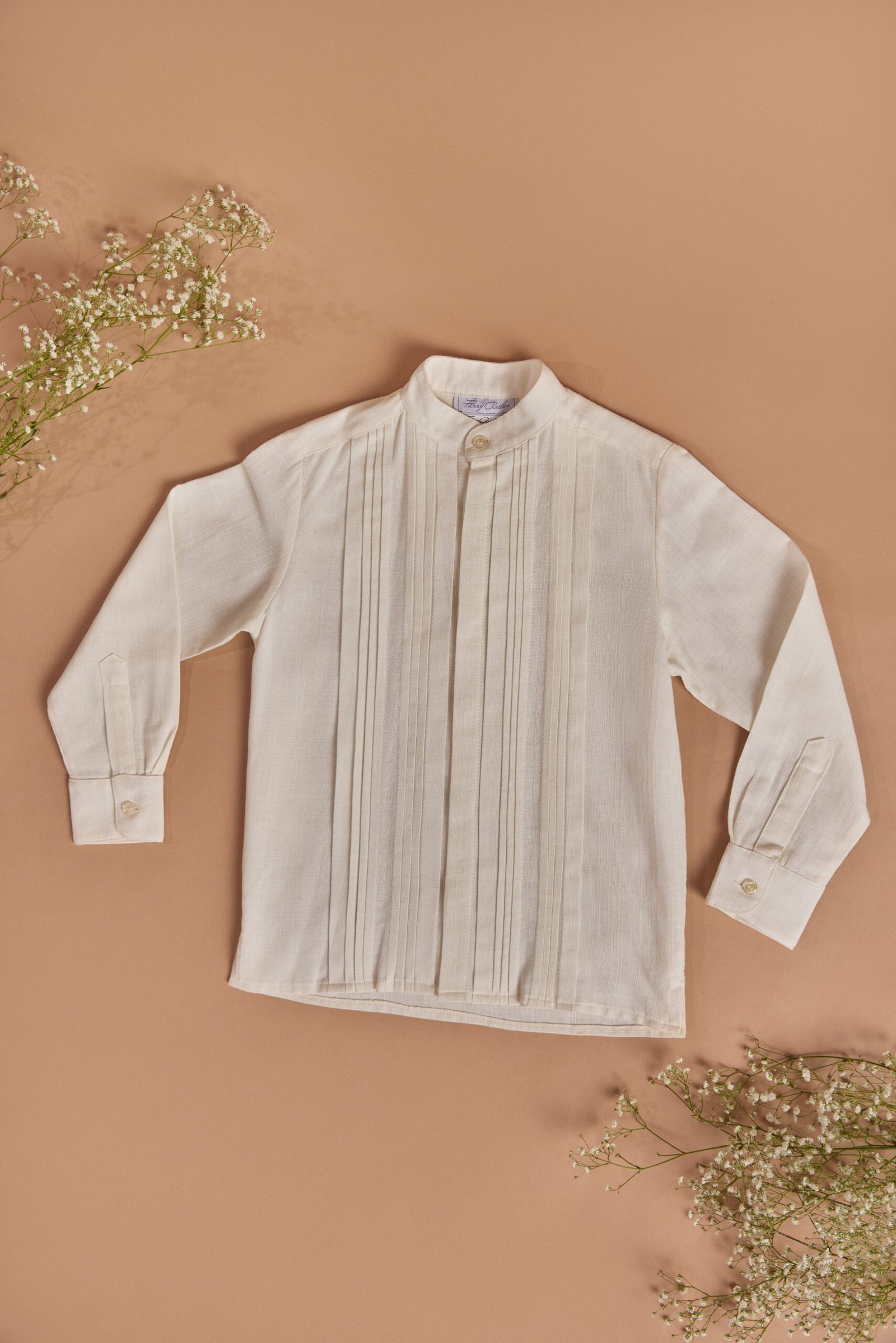Camisa trabajada a mano con alforza mini, cuello Mao y manga larga con puño elaborada en algodón y 100% con textura de lino.