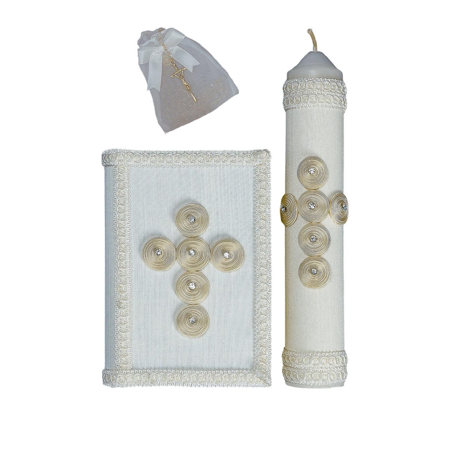 Una propuesta que resalta por su diseño visualmente atractivo y su cuidada distribución de elementos, donde la cruz central se construye a partir de formas circulares que generan un efecto dinámico y diferente, aportando identidad propia al conjunto. Cada uno de estos detalles crea un juego visual interesante, añadiendo profundidad y ritmo sin perder la armonía del diseño. El marco que rodea la pieza aporta equilibrio y delimita la composición, haciendo que el conjunto luzca ordenado y bien definido. La vela complementa perfectamente el estilo, replicando los mismos elementos para mantener una continuidad visual que refuerza la estética general. La combinación de formas, relieves y acabados crea una pieza que destaca desde cualquier ángulo, logrando un balance entre modernidad y tradición. Este set es ideal para ceremonias especiales donde se busca un diseño elegante, con carácter y cuidadosamente elaborado en cada uno de sus detalles.