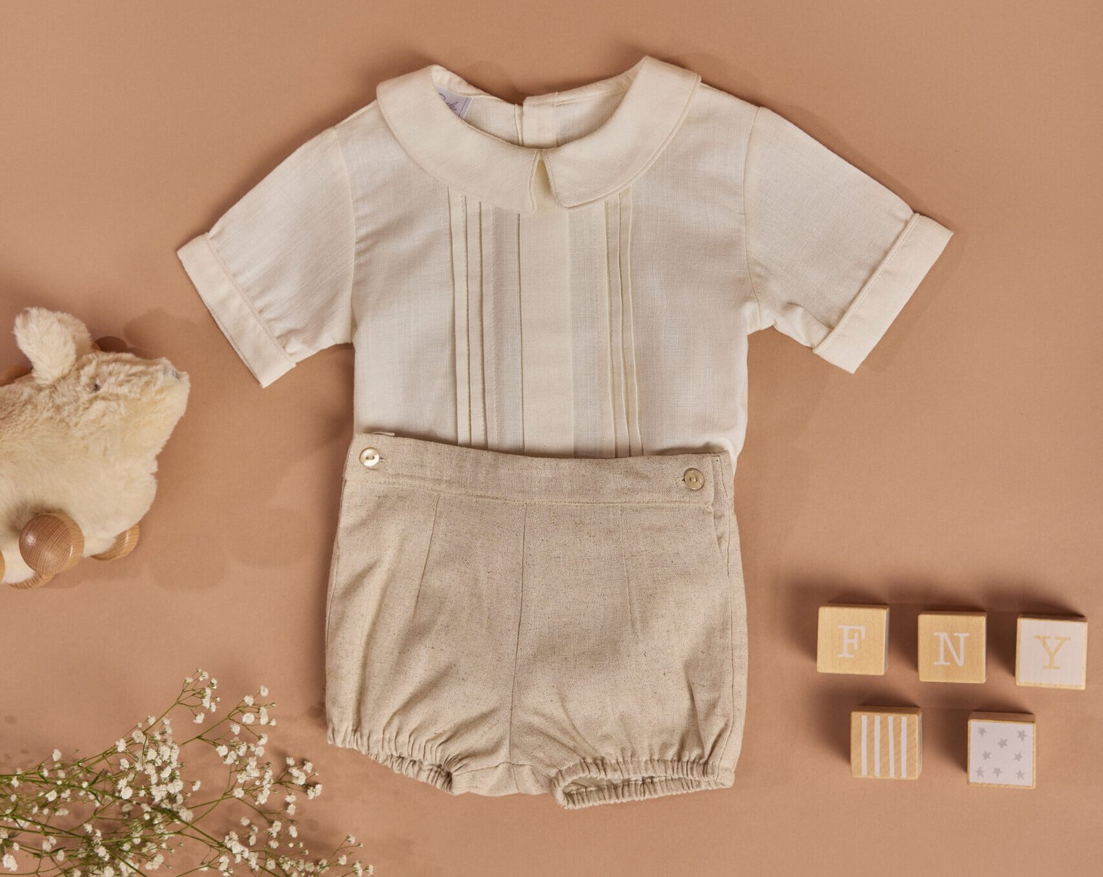 Conjunto de camisa alforzada y short jaspeado, elaborado en lino y algodón.