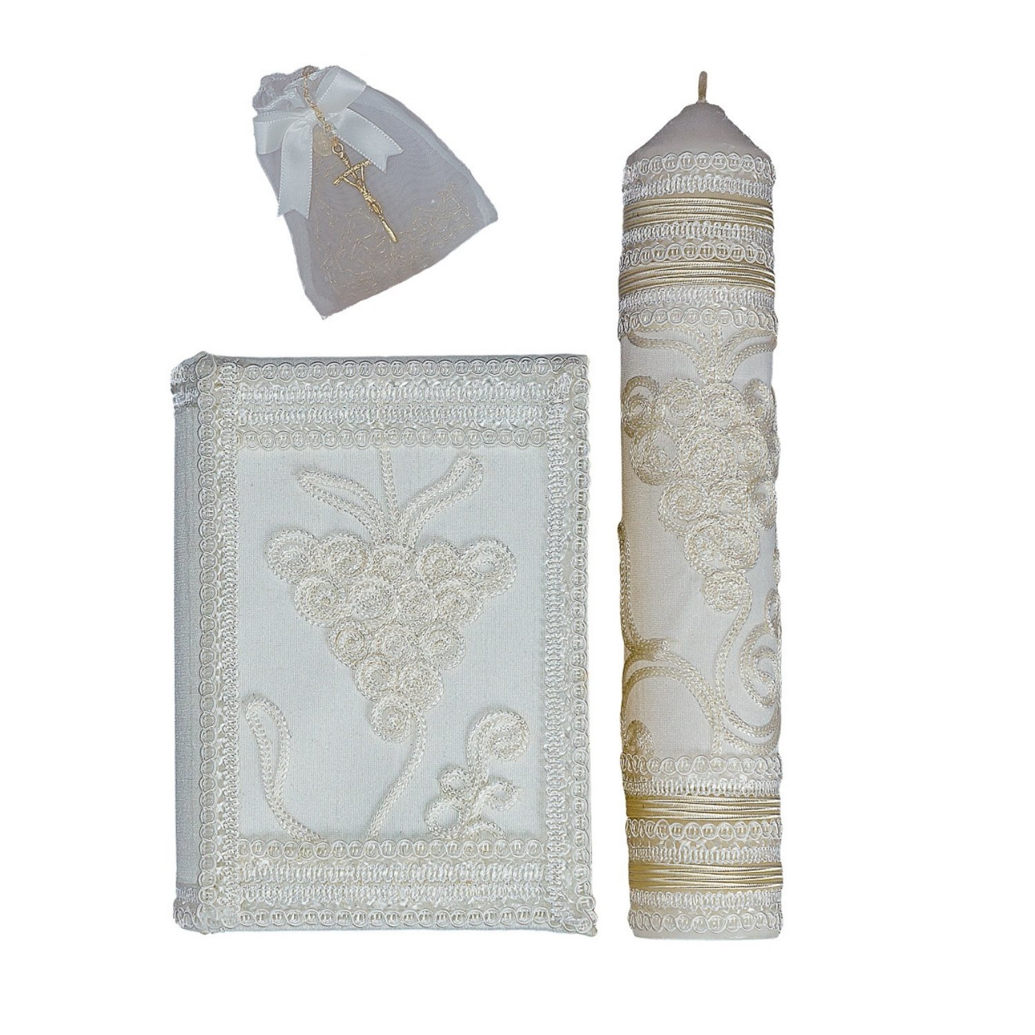 Un concepto que destaca por la integración de formas orgánicas inspiradas en la naturaleza, donde los relieves crean una composición visual rica y sofisticada. La figura central, con detalles que evocan racimos y curvas suaves, aporta dinamismo sin perder la elegancia del conjunto. El marco decorativo delimita la pieza con precisión, generando un balance entre estructura y fluidez. La vela continúa con este mismo lenguaje visual, incorporando patrones que refuerzan la coherencia estética en cada elemento. La combinación de texturas, bordados y relieves genera profundidad y un atractivo visual sutil, dando como resultado una pieza refinada, ideal para celebraciones especiales donde el detalle y la armonía son protagonistas.