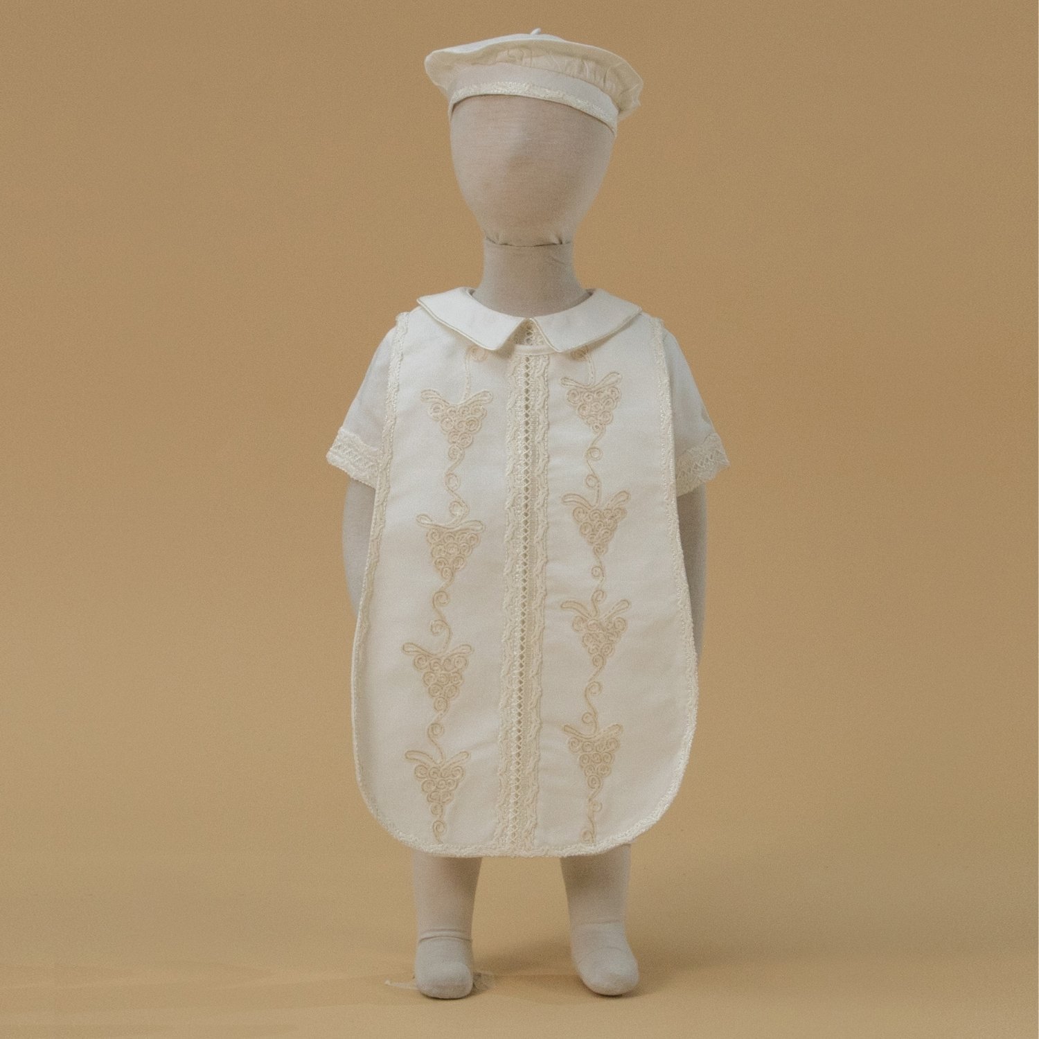Un ropón desmontable de niño, que tiene una elegante capa decorada con bordado de uvas. Incluye boina