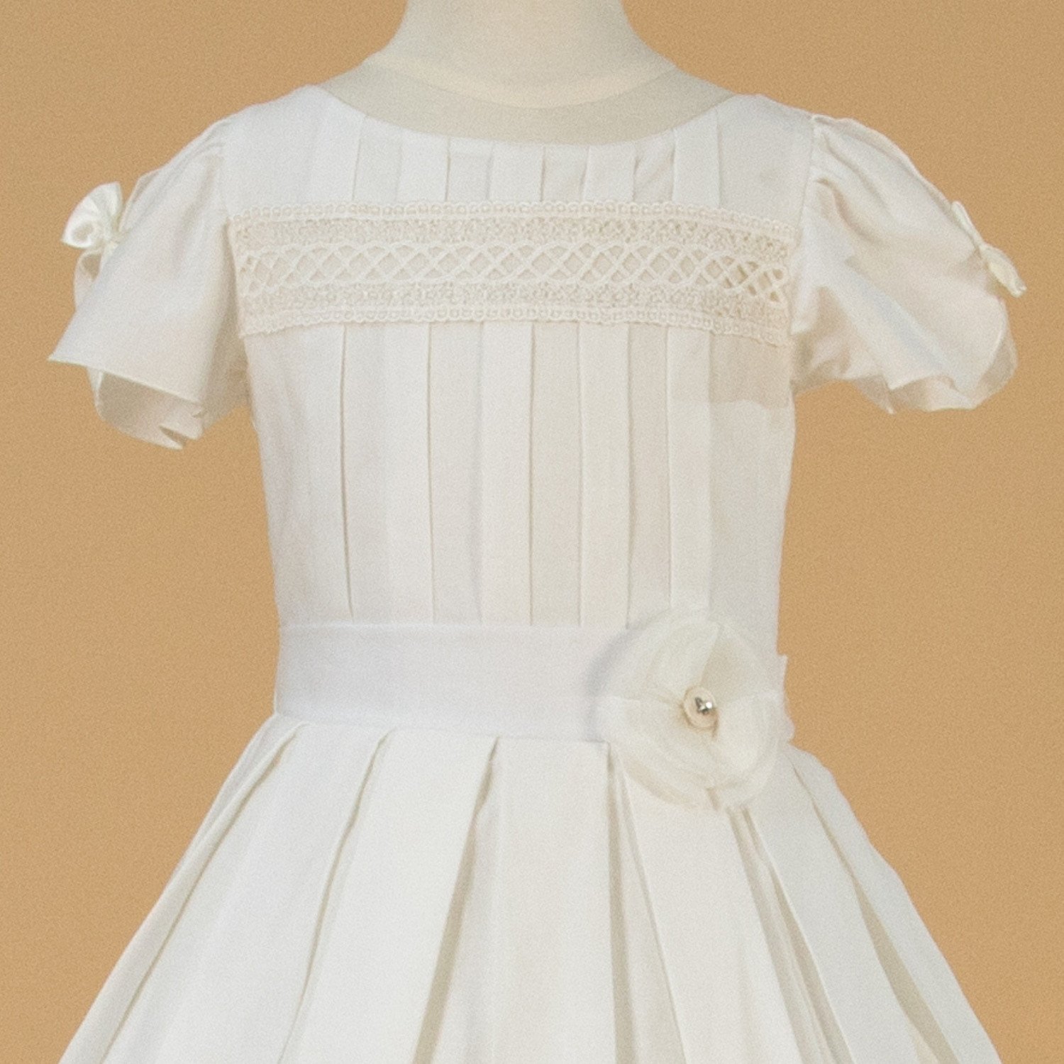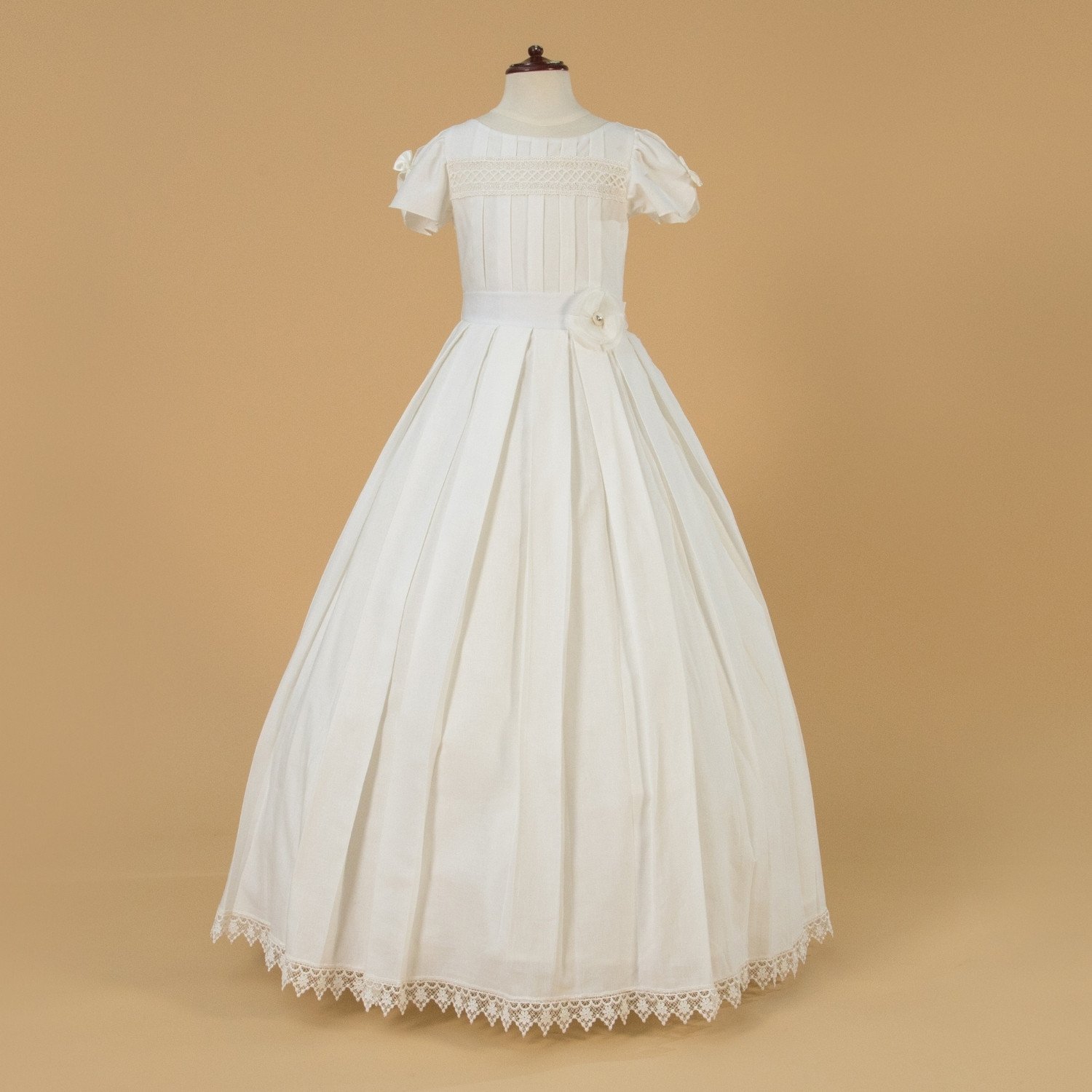 Vestido de primera comunión con tablones, encaje y alforzas.