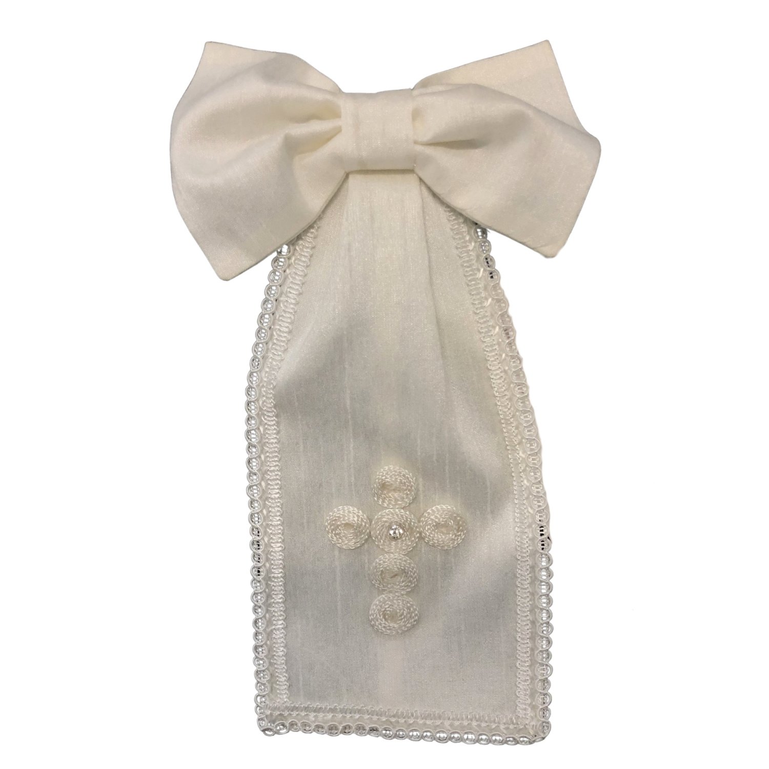 Accesorio con moño amplio y caída ligera, decorado con una cruz formada por delicados detalles textiles y bordes con encaje fino que enmarcan la pieza.