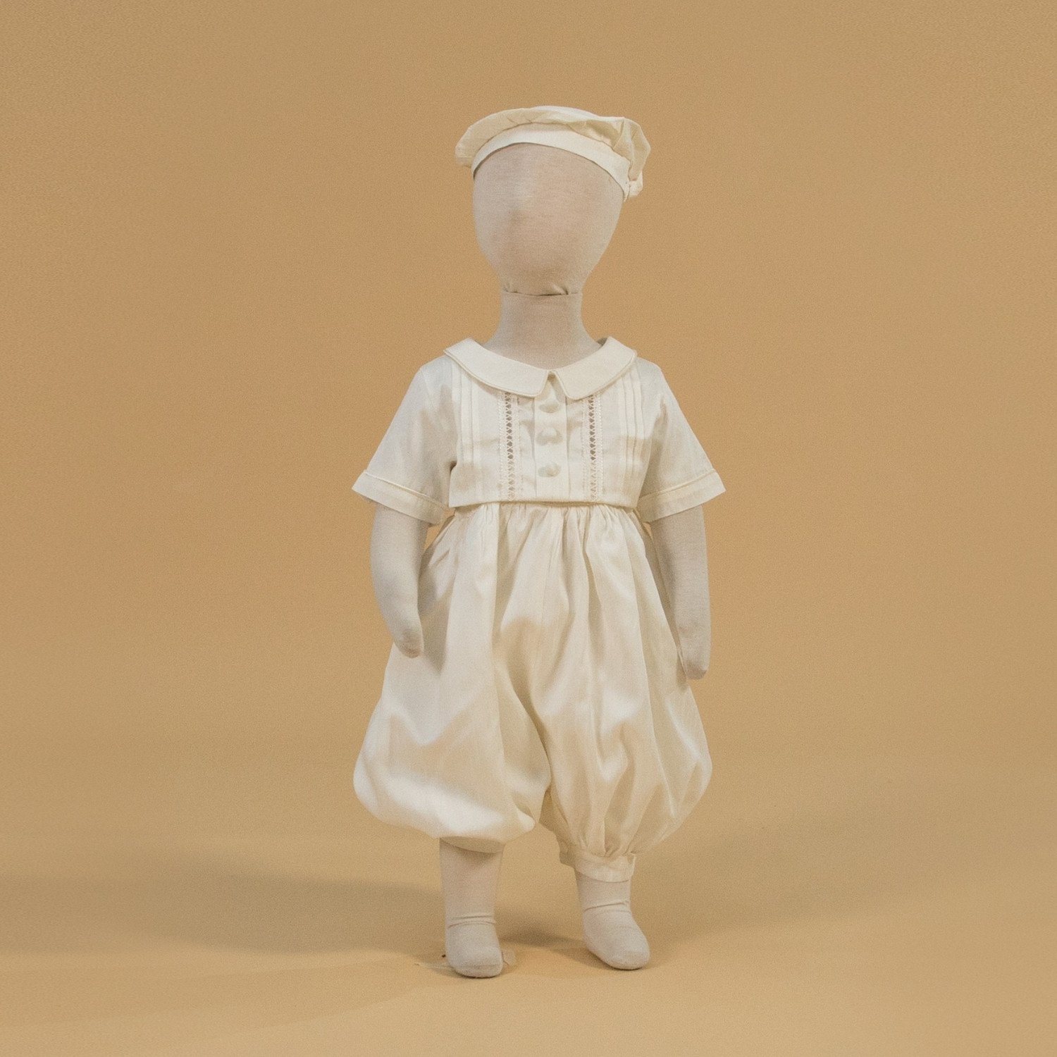 Un ropón desmontable de niño, que tiene un elegante faldón tableado de manera impecable. Se pone en una pretina especial que tiene el bombacho, de manera que se puede abrochar y desabrochar, sin que se note que está añadida la falda, Incluye boina y estola.