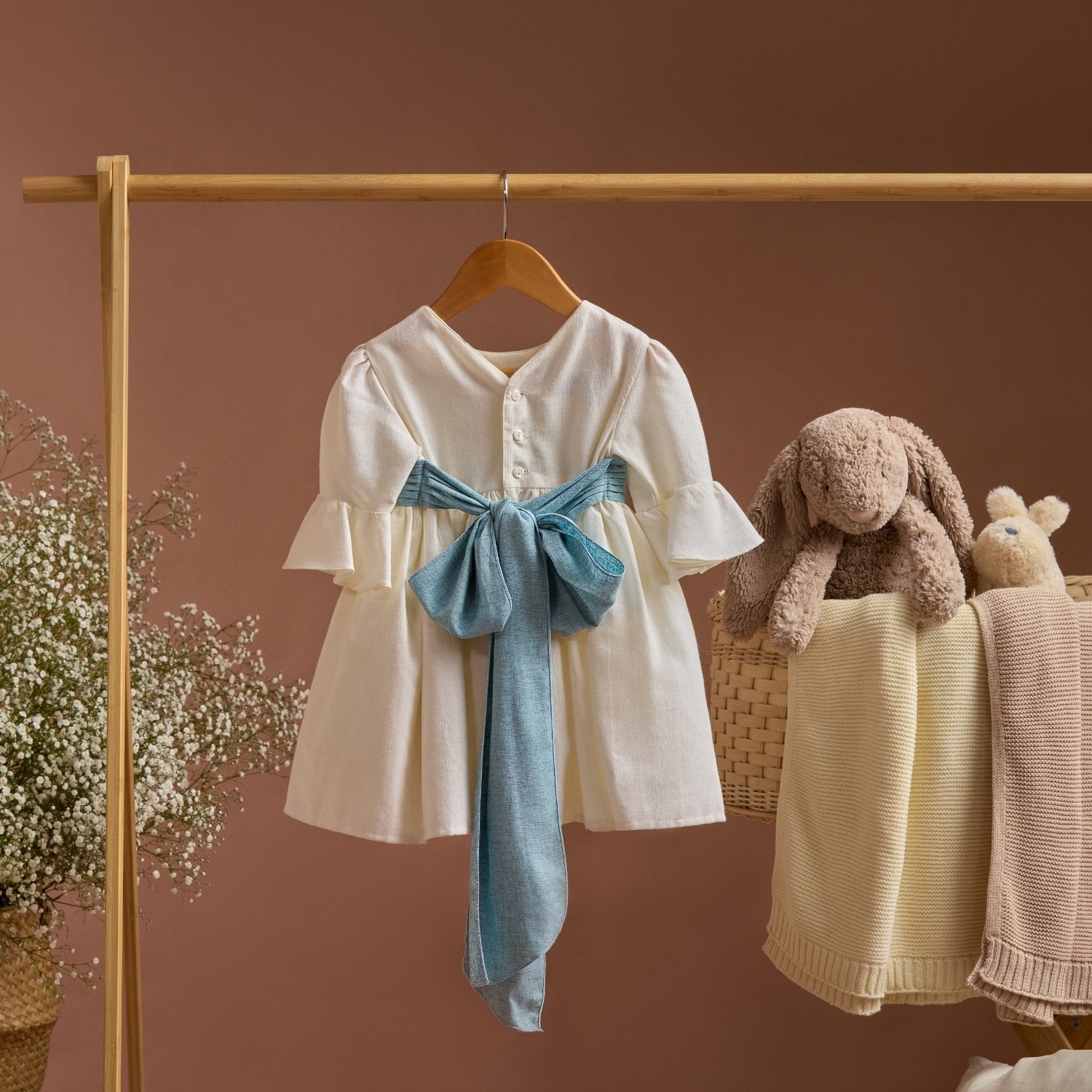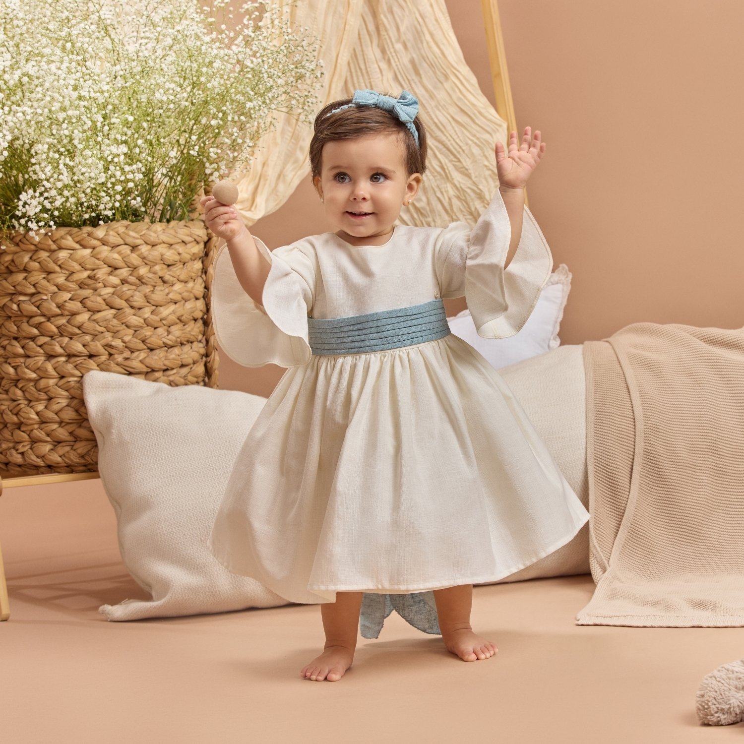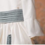 Vestido elaborado en algodon con textura de lino, tiene una hermosa banda azul drapeada al frente para hacer un gran moño en la parte de atrás, amplia falda con crinolina, manga 3/4 con una escarola circular a la orilla.