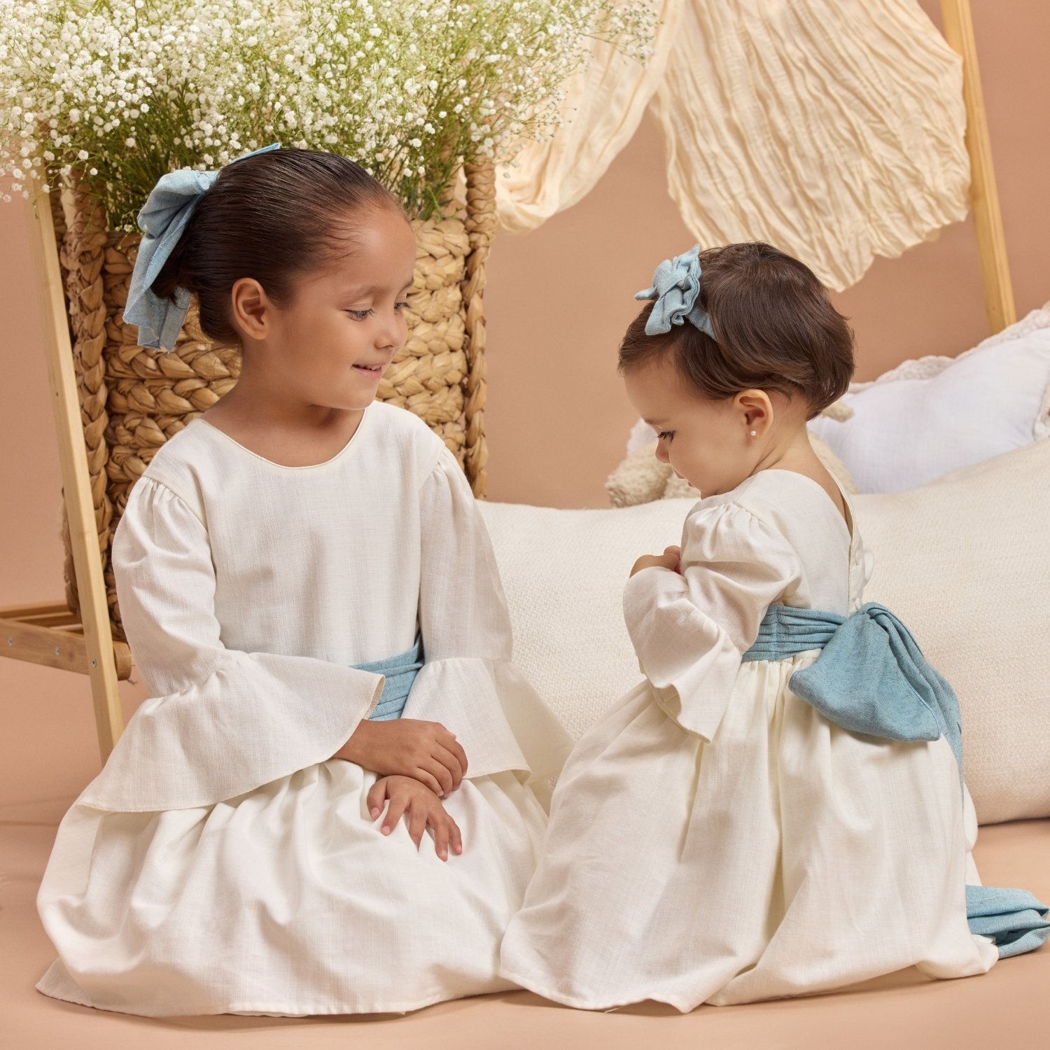Cuenta con accesorio para la cabeza, una tiara con moño en el caso de los bebés y un moño con broche para las niñas