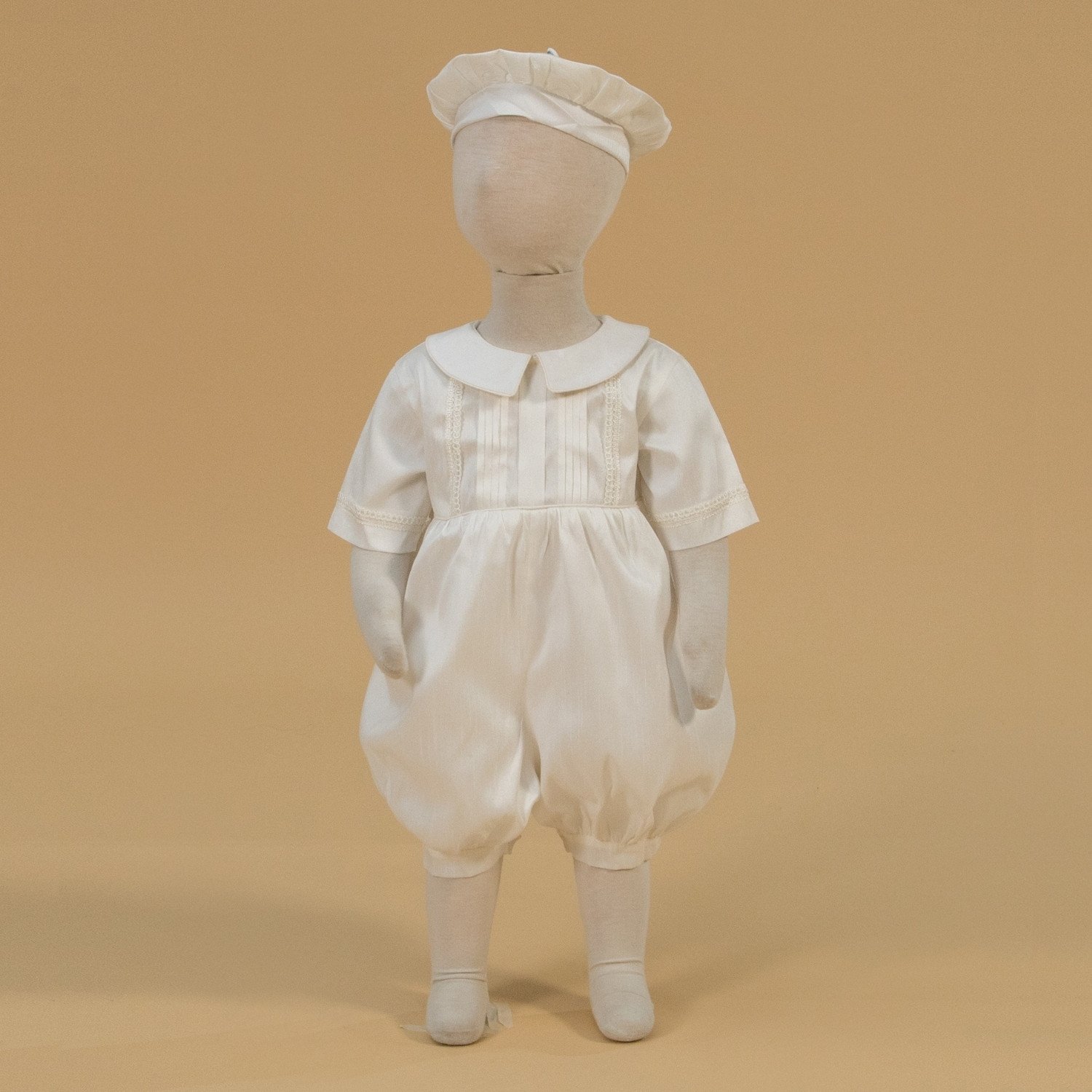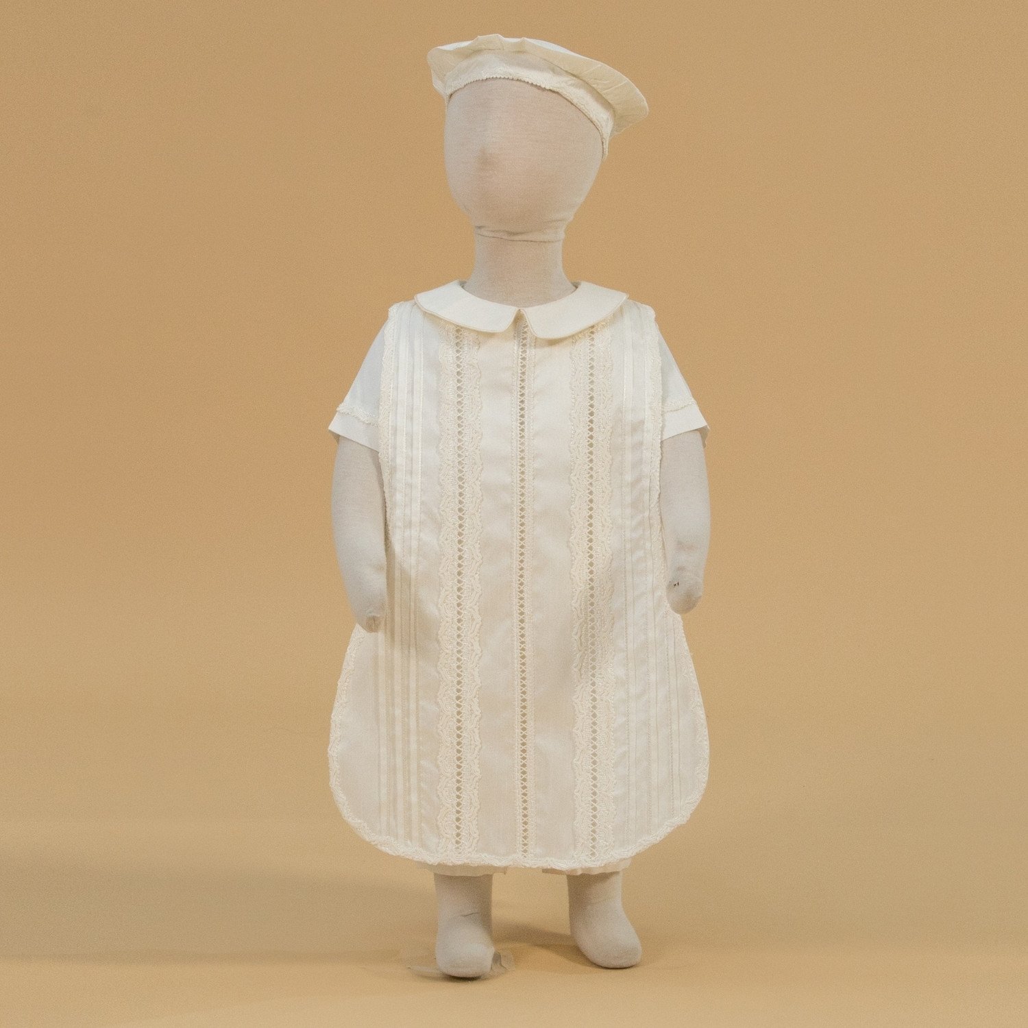 Éste es un Ropon con capa, incluye tres piezas, un bombacho con alforzas en el talle y decoración en mangas, cuello y bajo talle de bies con piola alforzas hechas a mano. Ponemos el mismo detalle en la prenda interior como exterior, ya que estamos conscientes que la comodidad del bebé es lo más importante. Usada para la fiesta y muchas veces más